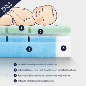 Hochwertige Babymatratze aus drei Schaumschichten für eine sanfte, aber dennoch stabile Liegeposition.